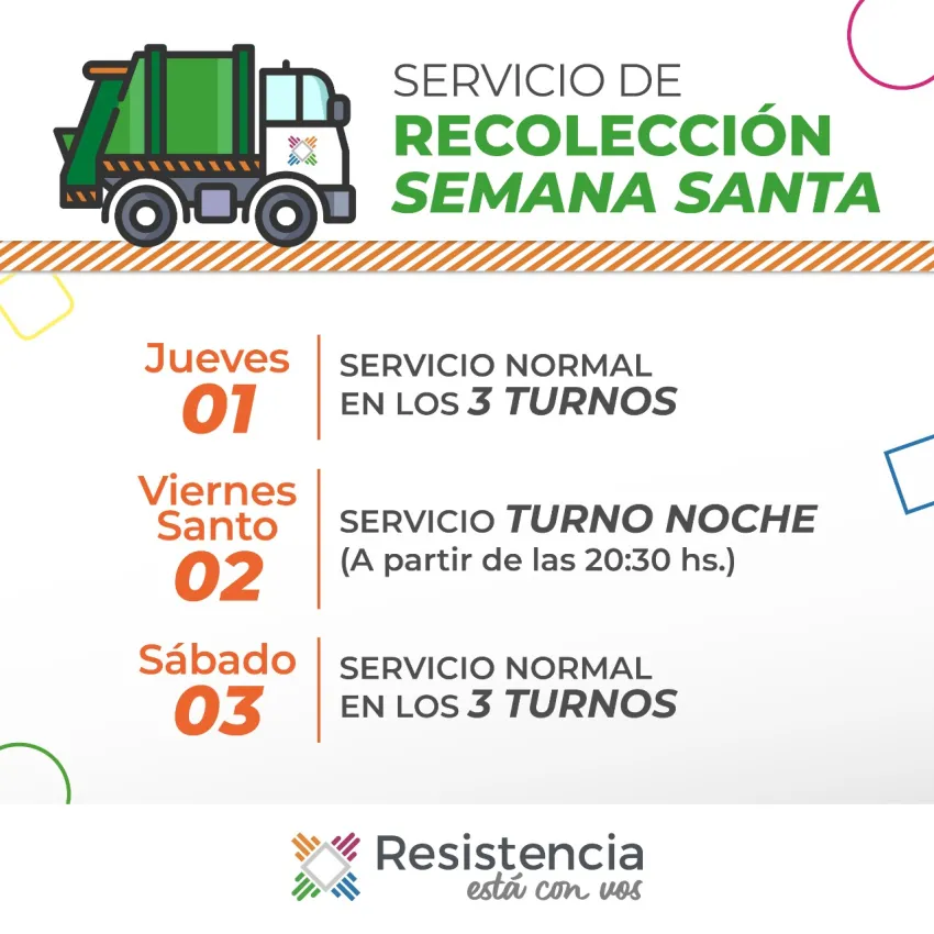 El Municipio de Resistencia comunicó a todos los vecinos y vecinas sobre el funcionamiento del servicio de recolección domiciliaria de residuos para la Semana Santa.