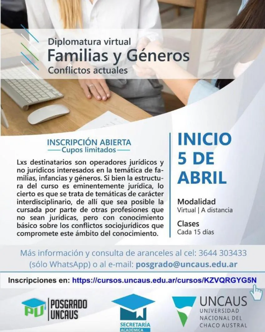 El próximo 5 de Abril inicia la Diplomatura virtual en Familias y Géneros, conflictos actuales que dictará la Universidad Nacional del Chaco Austral.