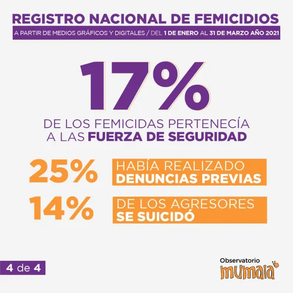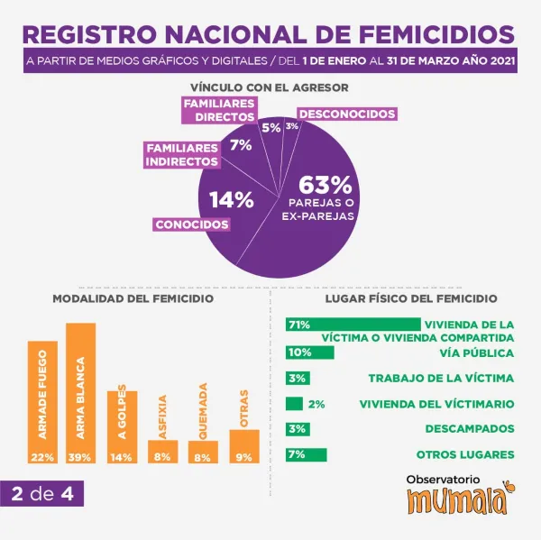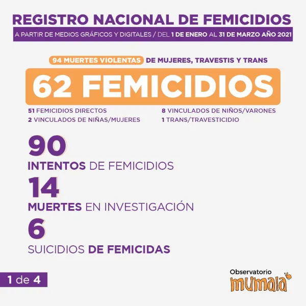 La coordinadora de Mumala Chaco, Paula Ojeda informó que: "Desde el 1 al 31 de marzo del 2021 se contabilizaron 62 femicidios, es decir un femicidio cada 35 horas, de los cuales 51 son de manera directa, 2 vinculados de niña o mujer y 8 vinculados a niños o hombres".