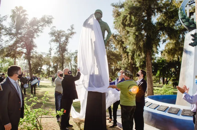 Con mucha emotividad, el homenaje incluyó la inauguración de la puesta en valor de la escultura de los ex combatientes, la cual fue realizada por el artista Rubén Darío Marcoff y cuenta con placas de mármol, donadas por el señor Ricardo Pistek, y que tienen grabadas los nombres de los chaqueños que perdieron la vida en la guerra.