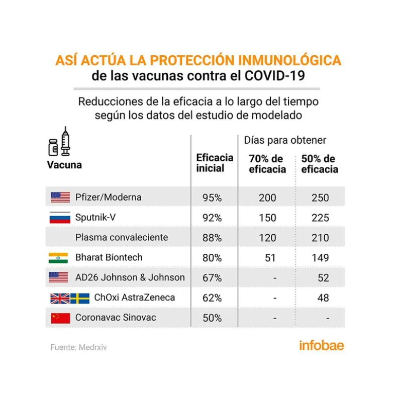 Otro resultado que aportó el trabajo es que existirían diferencias con respecto a los niveles de anticuerpos neutralizantes según la vacuna que se aplique. Las vacunas de Pfizer y Moderna fueron las más eficaces, con una eficacia inicial del 95% que no descendió al 50% hasta el día 200 aproximadamente. La vacuna Sputnik V mantuvo una eficacia del 70% a los 150 días y del 50% a los 125 días.