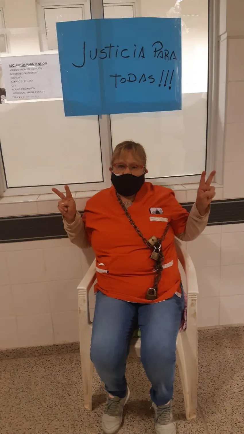 Se trata de Rosa Vallejos, una empleada del Hospital 4 de Junio, que cumple funciones en el Servicio de Alimentación hace 33 años, quien se encadenó en uno de los pasillos del nosocomio en reclamo por el esclarecimiento de las denuncias que realizaron por violencia de género contra personal del hospital.