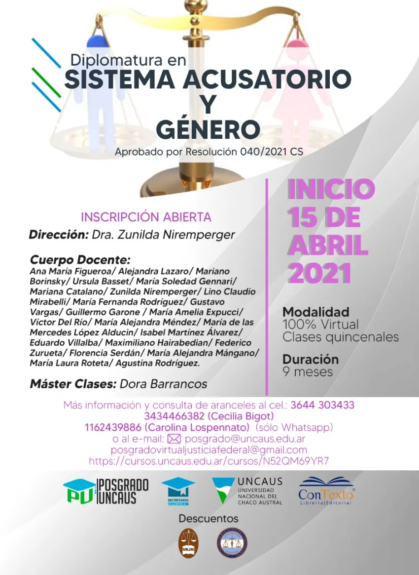 La segunda Diplomatura es titulada "Sistema Acusatorio y Género" y dará inicio el 15 de abril del corriente año, con una duración de 9 meses. La misma también cuenta con Resolución avaladora de la Universidad N° 040/2021- C.S.