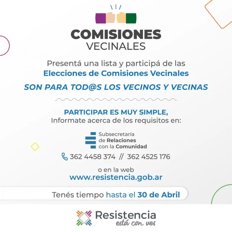 La Municipalidad de Resistencia recuerda que hasta el 30 de abril rige el plazo para que vecinos y vecinas de la capital chaqueña puedan presentar sus listas para la elección de las comisiones vecinales. Los interesados en sumarse a esta iniciativa democrática local pueden consultar la página resistencia.gob.ar y allí podrán despejar sus dudas.
