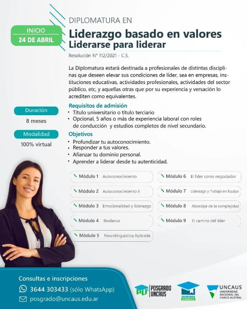 La Universidad Nacional del Chaco Austral (UNCAus) a través de Secretaría Académica- Área de Posgrado, invita a participar de esta nueva Diplomatura que iniciará el 24 de abril y que se realizará con los objetivos de profundizar el autoconocimiento, responder a los valores, afianzar el dominio personal y aprender a liderar desde la autenticidad.