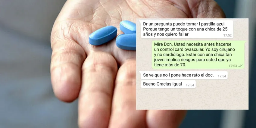 "Doctor una pregunta, ¿puedo tomar la pastilla azul? Porque tengo un toque con una chica de 25 años y no quiero fallar", planteó el paciente mediante un mensaje. Razonablemente, Picón le explicó que para eso antes debía realizarse controles médicos.