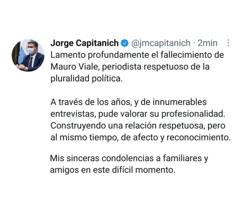 "Lamento profundamente el fallecimiento de Mauro Viale, periodista respetuoso de la pluralidad política. A través de los años, y de innumerables entrevistas, pude valorar su profesionalidad. Construyendo una relación respetuosa, pero al mismo tiempo, de afecto y reconocimiento", manifestó el mandatario.