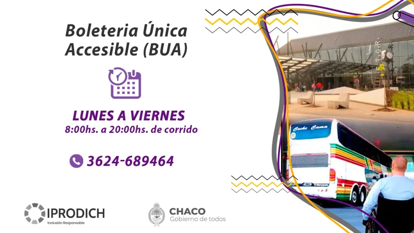 El Instituto Provincial para la Inclusión de las Personas con Discapacidad del Chaco (IPRODICH) comunicó que la "Boletería Única Accesible" en la Terminal de Ómnibus de Resistencia atiende de lunes a viernes, de 8 a 20. Las y los interesados se pueden contactar mediante llamada o WhatsApp al 3624-689464.