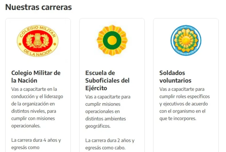En el sitio https://www.argentina.gob.ar/ejercito/incorporacion mencionan las tres carreras disponibles y garantizan estabilidad laboral, educación (se puede terminar el secundario y continuar la carrera como oficial o suboficial), salario mensual, obra social, aportes previsionales y vacaciones pagas de 30 días anuales.