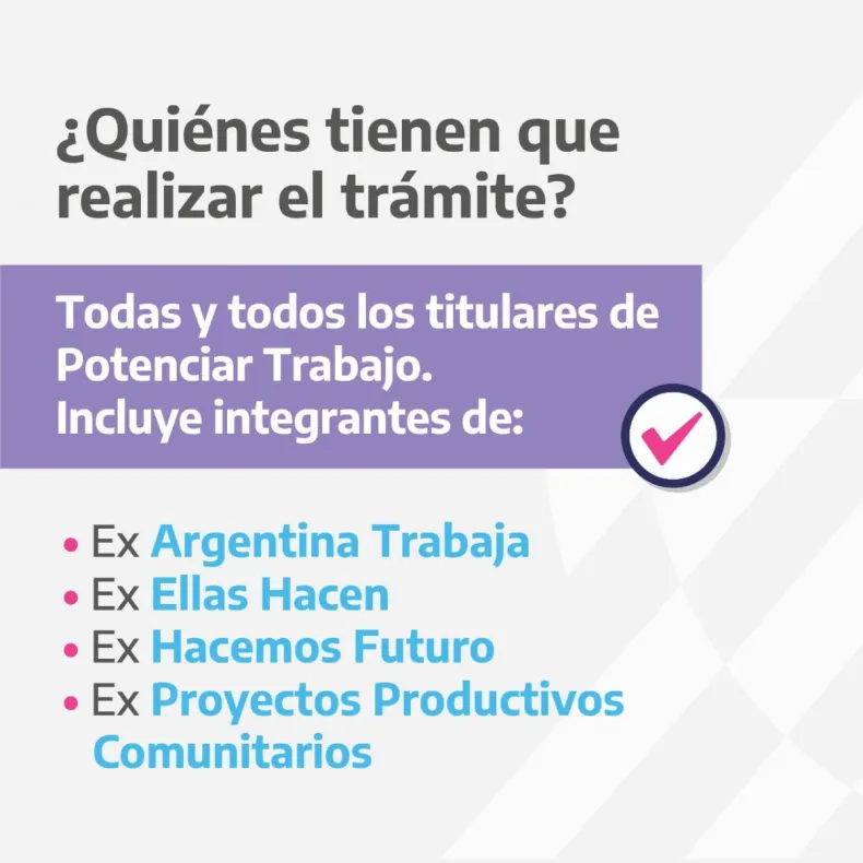 El llamado es universal y alcanza a quienes antes estaban en las propuestas denominadas Argentina Trabaja, Ellas Hacen, Hacemos Futuro y Proyectos Productivos Comunitarios, quienes deberán ingresar a www.argentina.gob.ar/desarrollosocial , y desde allí efectuar las dos etapas de las que consta el proceso.