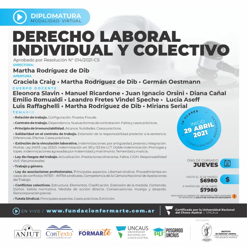 La diplomatura, que se encuentra aprobada por Resolución N° 014/2021- C.S. de la universidad, es organizada por la propia institución, junto con ANJUT, Fundación Formarte y se adhiere el Instituto de Derecho Laboral del Consejo Profesional de Abogados y Procuradores de Resistencia.