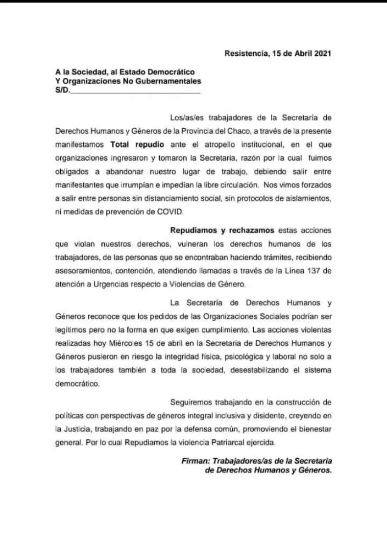 Los trabajadores de la Secretaría de Derechos Humanos y Géneros hicieron pública una nota de repudio ante la toma realizada en el lugar a modo de protesta.