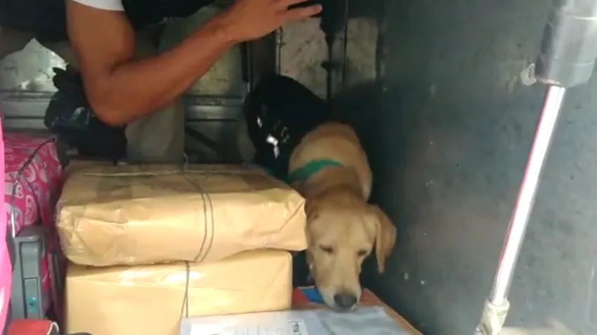Seguido a ello fueron al compartimiento de encomiendas, donde Balton olfateo y mordió una caja de zapatos, que estaba envuelto con cinta y en su frente contaba con la dirección y nombre del destinario.