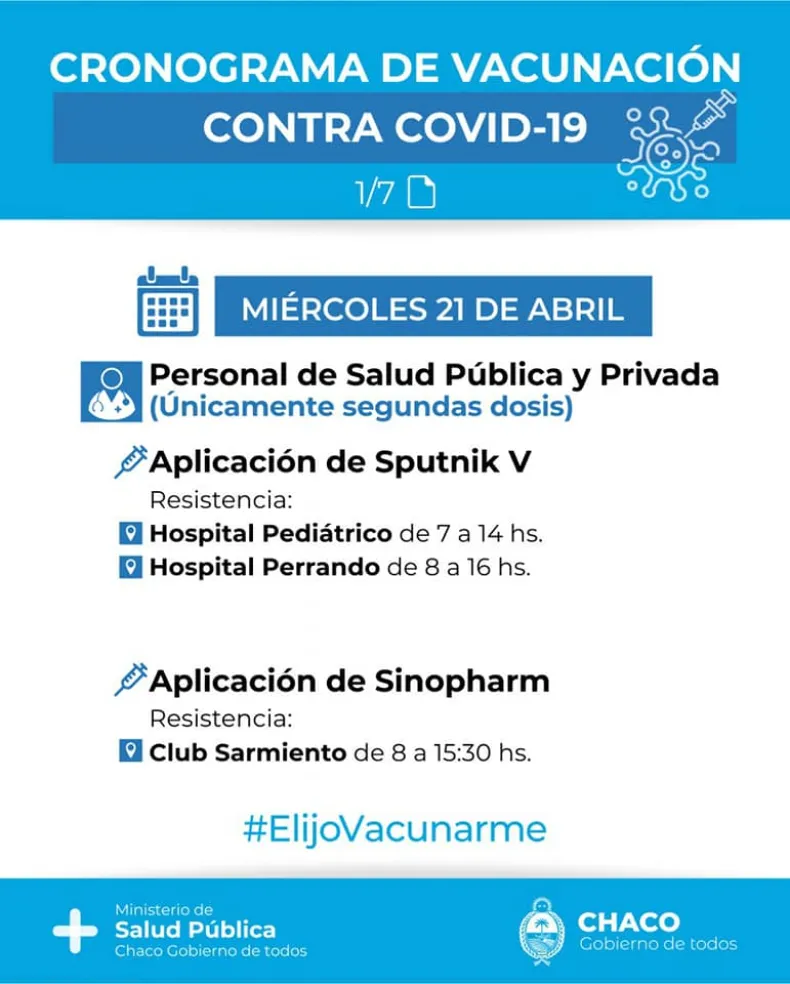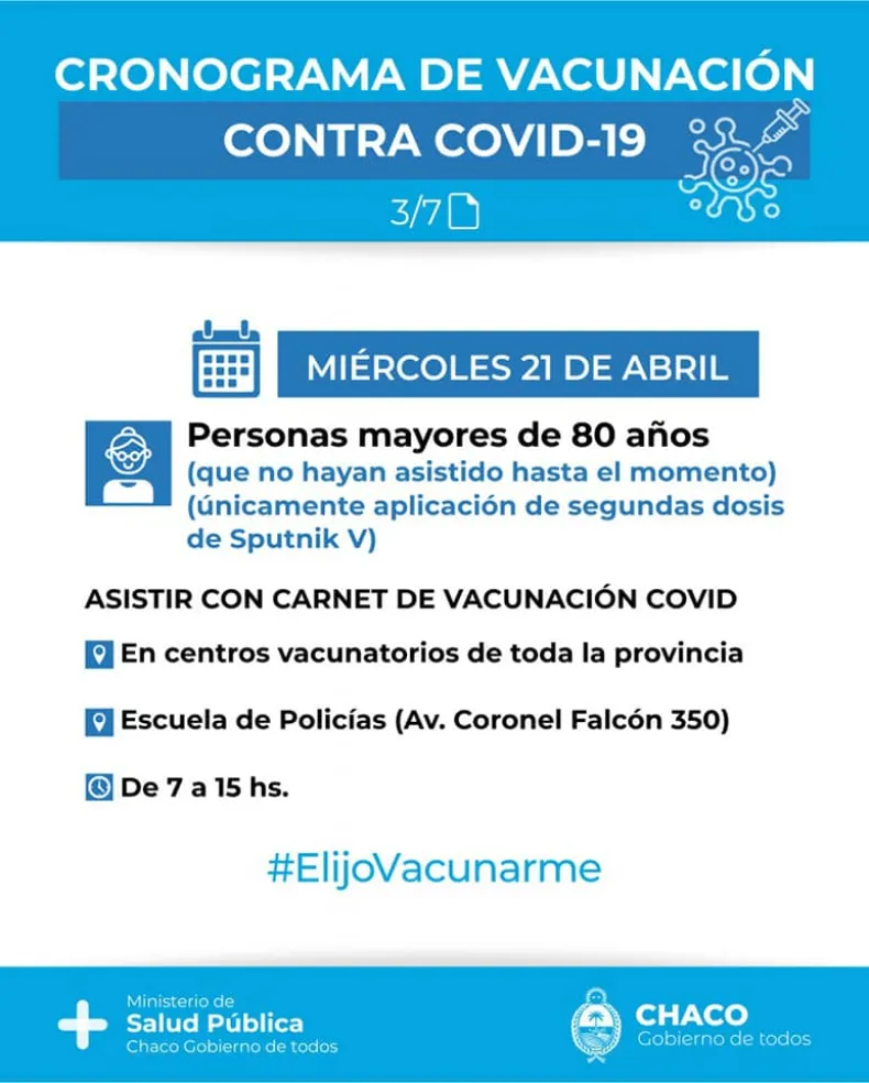 Las personas mayores de 80 años que deban recibir la segunda dosis de la vacuna Sputnik V deberán asistir este miércoles a los centros de vacunación de toda la provincia y a la Escuela de Policías en Resistencia (avenida Coronel Falcón 350) con el carnet de vacunación COVID, en el horario de 07:00 a 15:00 horas.