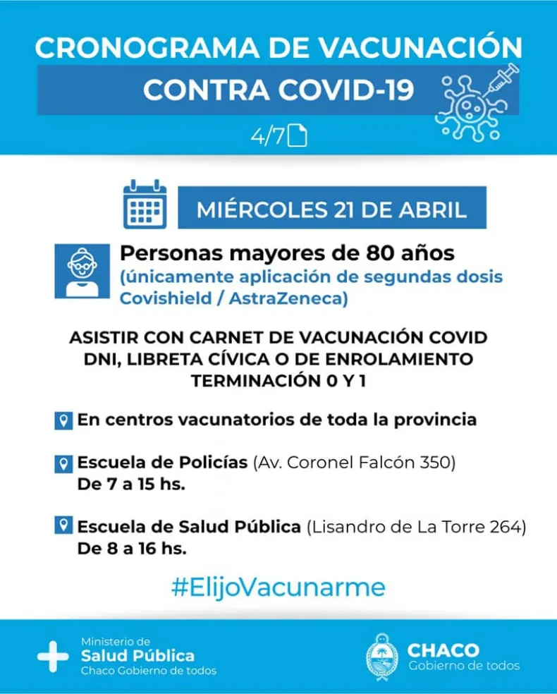 Este miércoles 21 de abril, el Ministerio de Salud de Chaco inició con la aplicación de la segunda dosis de la vacuna Covishield contra el coronavirus en personas mayores de 80 años que ya hayan recibido la primera inoculación.
