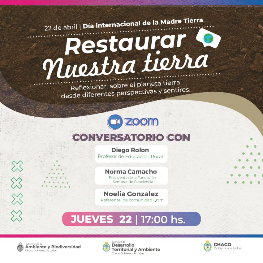 La Secretaría de Desarrollo Territorial y Ambiente invita a la comunidad a participar del Conversatorio por el Día Internacional de la Madre Tierra "Restaurar nuestra tierra". El mismo se realizará este jueves 22 de abril, a partir de las 17 horas, a través de la plataforma zoom a través del siguiente link: https://zoom.us/j/91927624809?pwd=emJvdDhEK09pK2dBa3E5b1pFZW1iZz09.El Día de la Madre Tierra fue celebrado por primera vez por las Naciones Unidas en 1970. Es un momento para celebrar, pero también una oportunidad para informarnos sobre el estado del medio ambiente y tomar consejos sobre cómo contaminar menos y preservar los ecosistemas."En este Día Internacional de la Madre Tierra necesitamos un cambio hacia una economía más sostenible, que funcione tanto para las personas como para el planeta", explicó la secretaria de Desarrollo Territorial y Ambiente Marta Soneira al respecto.La actividad es organizada por la Red Provincial de Voluntariado Ambiental de la Subsecretaría de Ambiente y Biodiversidad, que depende de la Secretaría de Desarrollo Territorial y Ambiente, buscando impulsar espacios de reflexión comunitarios.