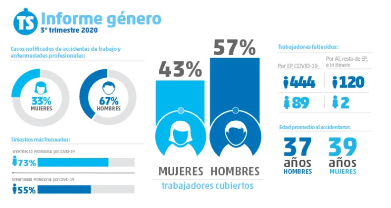 El informe expone la caída en la cantidad de trabajadoras y trabajadores cubiertos durante el 3er trimestre del 2020, 4% menos de varones respecto a igual período del año anterior y3,6% menos de mujeres. La mayor merma en las trabajadoras se dio en los servicios de alojamiento y servicios de comida con una caída del 17,5%.En las trabajadoras de casas particulares la caída alcanzó el 8,9%. La población total cubierta, trabajadoras y trabajadores asalariados registrados, consta de un 42,5% de mujeres y un 57,5% de varones.