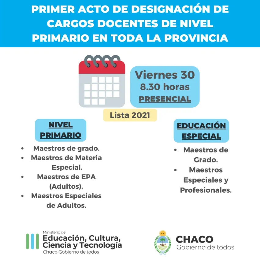 Desde el Ministerio de Educación del Chaco se informa que el viernes 30 de abril, a las 8.30, se llevará a cabo de manera presencial en distintas sedes de la provincia, el primer acto de designaciones de cargos docentes de Nivel Primario y de Educación Especial con el listado de aspirantes inscriptos en 2021.