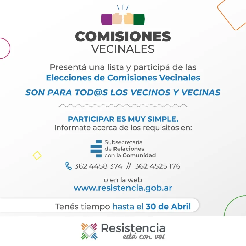 Este viernes 30 de abril es el último día para que los resistencianos presenten sus listas para la elección de las comisiones vecinales, y el Municipio de Resistencia reiteró que para ello pueden dirigirse a la Subsecretaría de Relaciones con la Comunidad, en avenida Italia 150, o consultar a los números 362458374 y 3624525176. Además, está disponible la página resistencia.gob.ar para despejar todas las dudas y obtener los formularios de inscripción de listas.