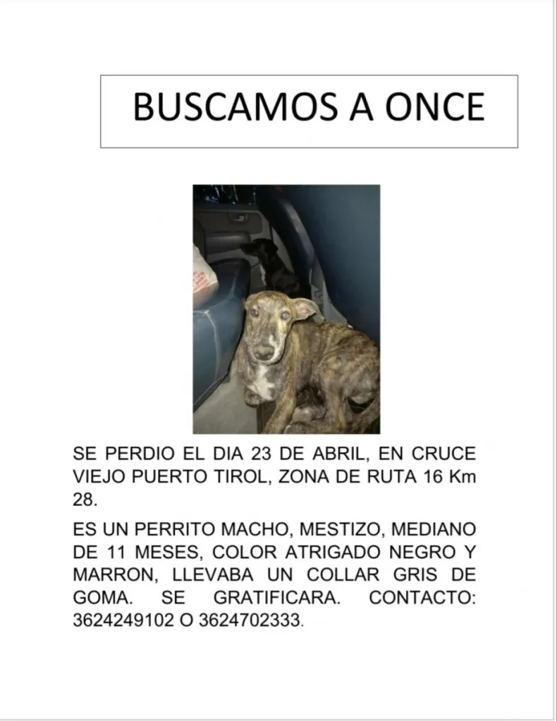 Se trata de un perro macho, mestizo, de tamaño mediano, coloro atigrado negro y marrón, de 11 meses que responde al nombre de "Once". Al momento de perderse llevaba con collar gris de goma.