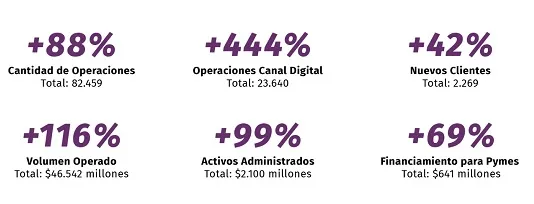 En porcentajes, durante el 2020 el Área de Inversiones de la entidad registró aumentos del +88% en cantidad de operaciones, de las cuales un 444% fueron a través del canal digital. La unidad de negocios MDC cerró su año con un +41% de clientes, los cuales generaron operaciones por un monto de $46.542 millones (+116% respecto del año anterior). Los activos administrados alcanzaron los $2.100 millones (+99% respecto del 2019).