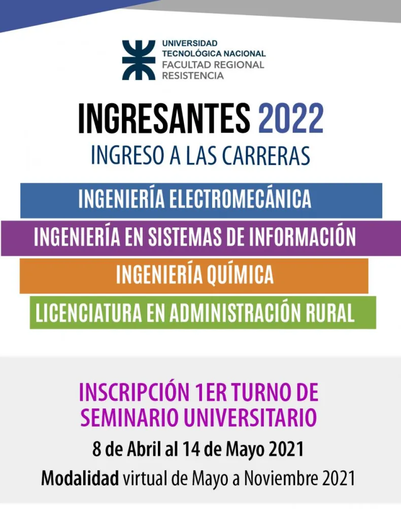 Hasta el viernes 14 de mayo se encuentra abierta la pre-inscripción online al Primer Turno del Seminario Universitario para ingresar en 2022 a las carreras de grado que se dictan en la Facultad Regional Resistencia de UTN. Las clases correspondientes al Seminario serán en modalidad virtual, de mayo a noviembre del año en curso.
