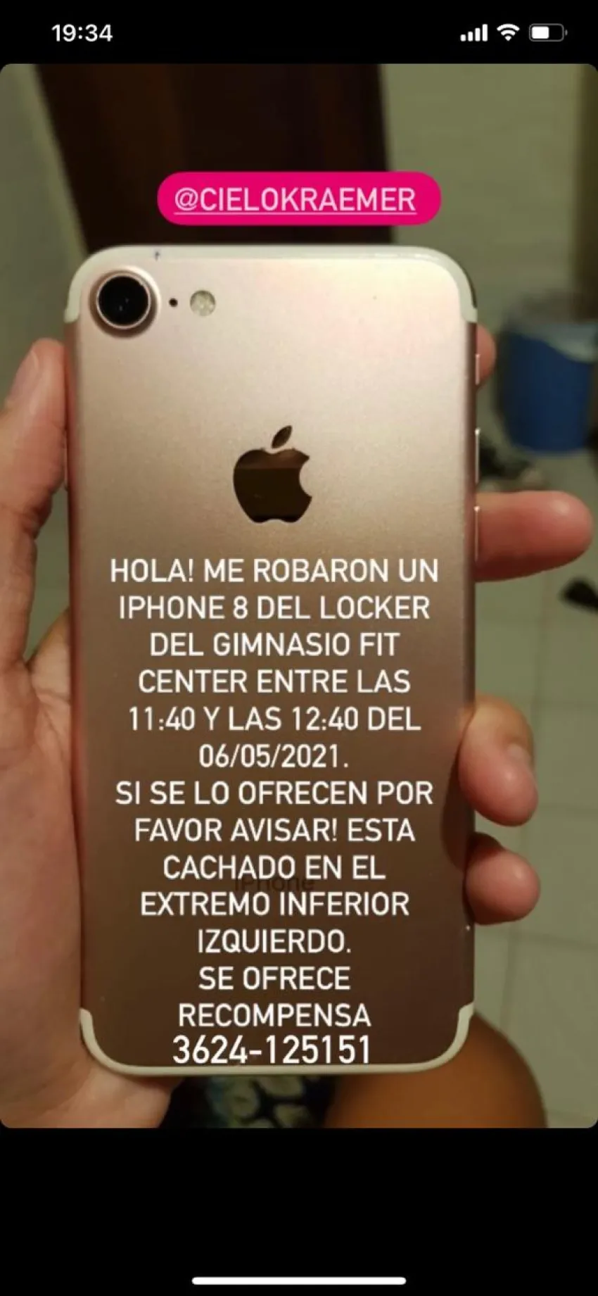 "Hola. Me robaron un IPhone 8 desde el locket del gimnasio Fit Center entre las 11.40 y las 12.40 del 6/5/2021. Si se lo ofrecen por favor avisar, está cachado en el extremo inferior izquierdo. Se ofrece recompensa 362 4 125151", escribió la dueña del celular.