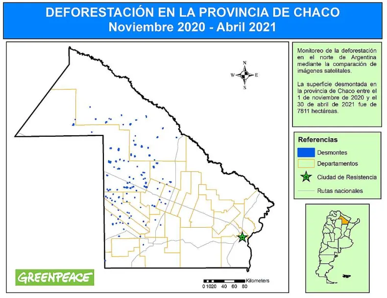 Según datos del Ministerio de Ambiente de la Nación, Chaco fue la provincia con más pérdida de bosques nativos entre 2016 y 2019, con 130.487 hectáreas deforestadas. Por su parte, el monitoreo satelital de Greenpeace detectó que, a pesar de las restricciones impuestas por la pandemia de COVID-19, durante 2020 en la provincia se perdieron 13.128 hectáreas de bosques.