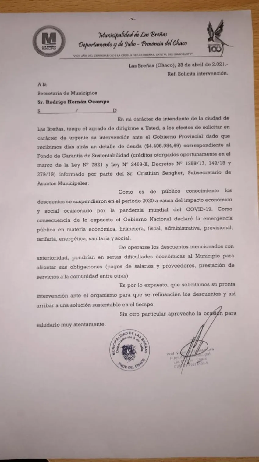 Machuca había solicitado a la cartera conducida por Rodrigo Ocampo la intervención urgente del gobierno provincial para evitar que Anses avance en el cobro de una deuda de $ 4.406.984,69 correspondiente a créditos otorgados a través del Fondo de Garantía de Sustentabilidad (FGS), ya que "de operarse los descuentos, pondrían en serias dificultades económicas al Municipio para afrontar pago de salarios y proveedores, y prestación de servicios a la comunidad".