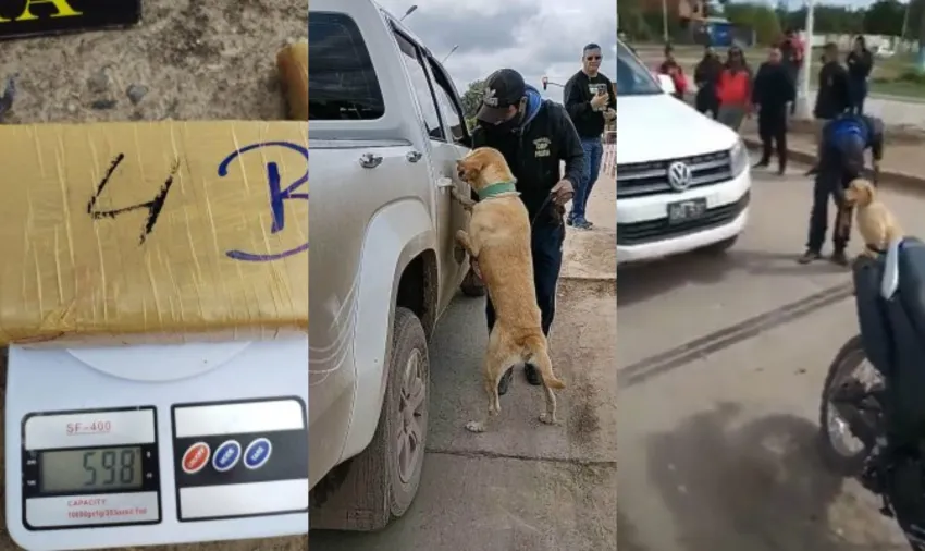 Con el despliegue del can Balton, el perro detector de estupefacientes, hallaron en el interior de la camioneta cuatro envoltorios, tres de ellos de forma rectangular y otro de pequeño tamaño que contenían una sustancia vegetal con olor similar a marihuana.
