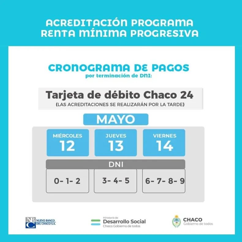 En este sentido, este miércoles 12 de mayo a la tarde cobrarán los documentos que finalicen en 0, 1 y 2 a través de la tarjeta de débito Chaco 24 del Nuevo Banco del Chaco.