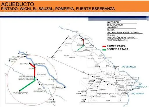 El acueducto transportará agua desde la localidad de Misión Nueva Pompeya a Fuerte Esperanza, incluyendo redes de distribución de agua potable para las poblaciones de Wichí, El Sauzal, Fuerte Esperanza y para comunidades indígenas y criollas dispersas en las inmediaciones.