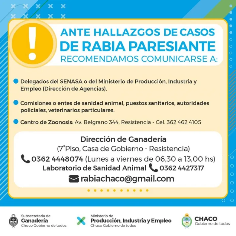 El Ministerio de Producción habilitó los siguientes canales para que los productores chaqueños puedan denunciar casos de rabia paresiante: el correo electrónico [email protected]; ante la Dirección de Ganadería, al teléfono fijo 3624-448074 (de lunes a viernes de 6.30 a 13); ante el Laboratorio de Sanidad Animal, al teléfono fijo 362-4427317; o bien a las distintas agencias de la cartera distribuidas en toda la provincia.