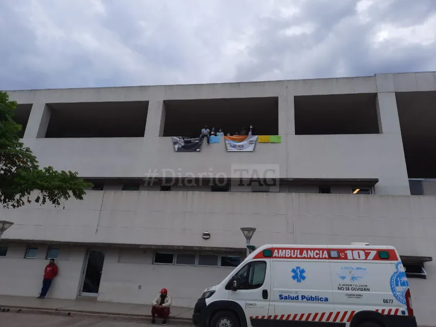 Desde alrededor de las 9 de este miércoles 5 de mayo, enfermeros del Hospital Pediátrico, nucleados en APTASCH se encuentran realizando una protesta desde el balcón del nosocomio en reclamo por pases a planta.