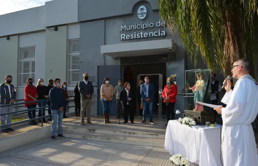 Como todos los años, el Municipio de Resistencia recibe la imagen de María Auxiliadora. En esta oportunidad, y respetando los protocolos sanitarios por pandemia, Gustavo, diversas autoridades y trabajadores municipales fueron parte de una pequeña ceremonia en el hall de acceso al edificio municipal de avenida Italia 150.