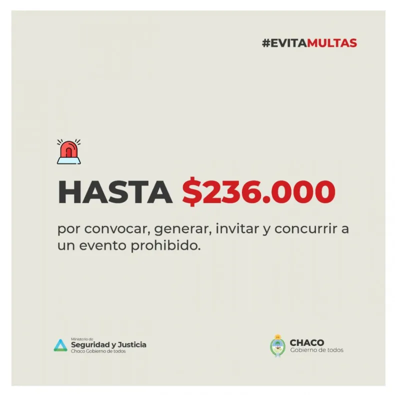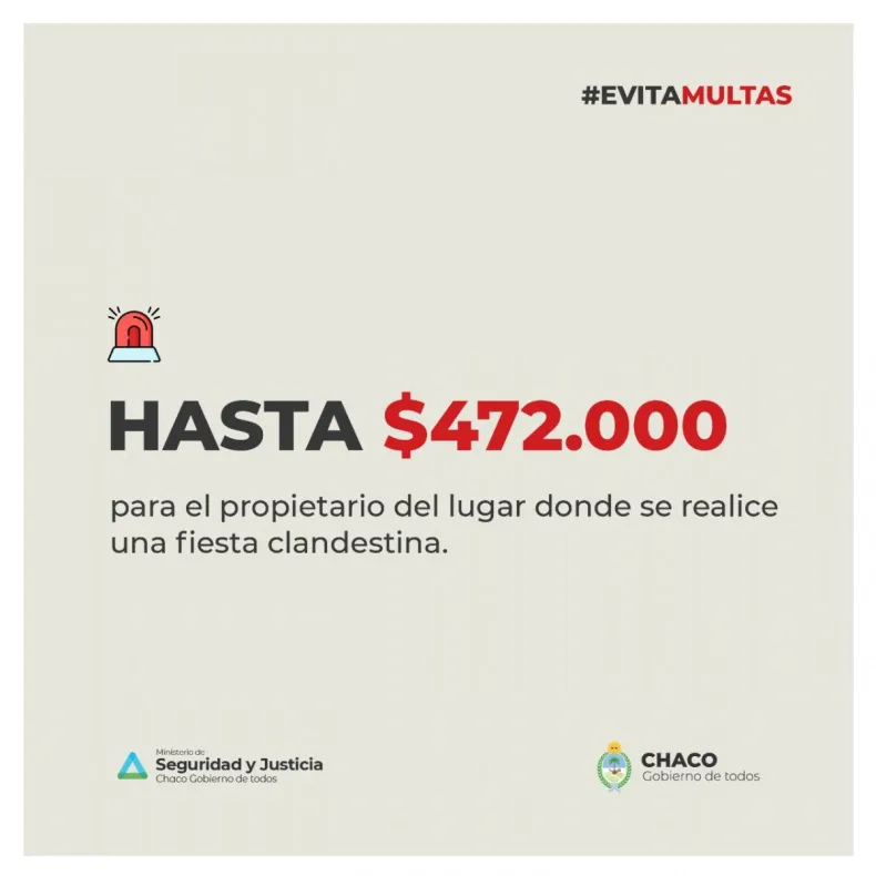 Así, anunció que habrá multas de 472.000 pesos para los propietarios de lugares donde se realicen fiestas clandestinas. El monto desciente a 236.000 pesos para aquellos que convoquen, genere, inviten o concurran a eventos prohibidos por las medidas vigentes hasta el próximo 31 de mayo.
