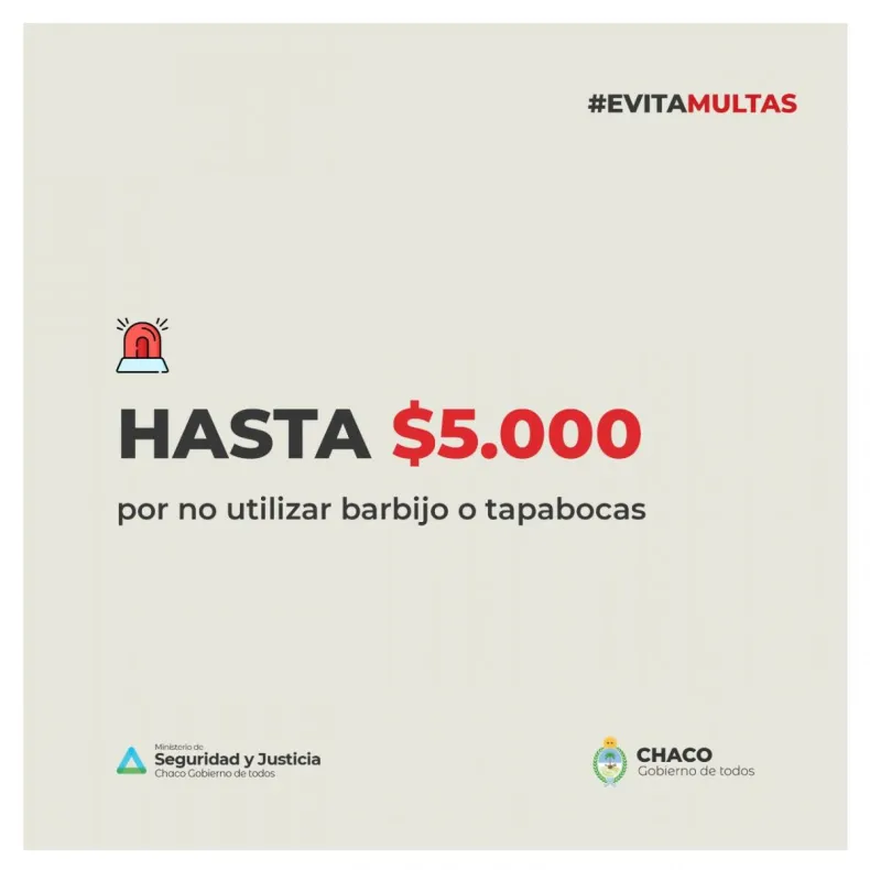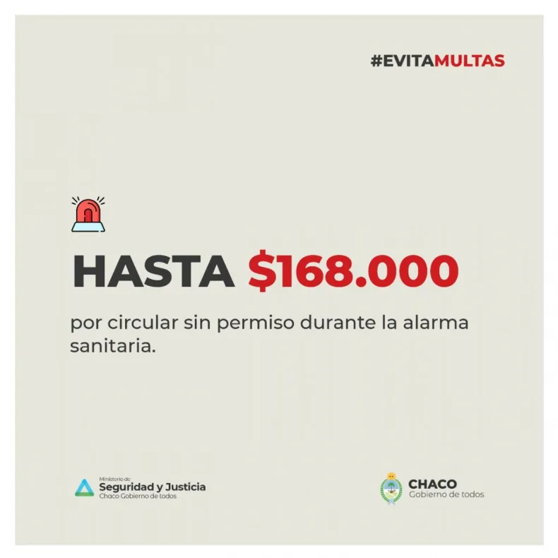 También multarán a quienes circulen sin permiso durante la alarma sanitaria con un monto de 168.000 pesos, y continúa en vigencia la multa de 5.000 pesos para quienes no usen barbijo o tapabocas.