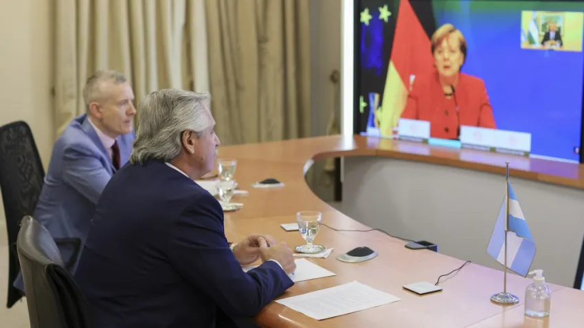 A las 10, Alberto Fernández inició una videoconferencia con Angela Merkel para coronar un acuerdo político multilateral que permitirá a la Argentina refinanciar sus vencimientos de deuda con el Fondo Monetario Internacional (FMI) y postergar el inminente pago al Club de París que está previsto para fin de mayo.