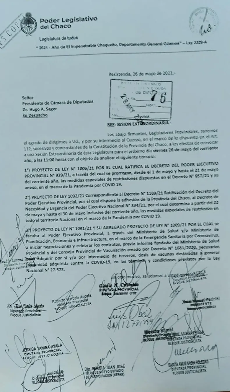 El presidente de la Legislatura, Hugo Sager, convoca a sesionar, a raíz del ingreso de la convocatoria de diputados y diputadas del Frente Chaqueño y del PRO, para debatir en extraordinaria el proyecto de ley 1091/2021 presentado por el gobernador Jorge Capitanich y su agregado el PL 1009/2021 del bloque radical, con el objetivo de otorgar una herramienta legislativa que permita la compra de las dosis, de manera directa, aumentando la capacidad de inoculación de la provincia, para que en menor tiempo chaqueños y chaqueñas accedan a inmunización frente al Covid-19.