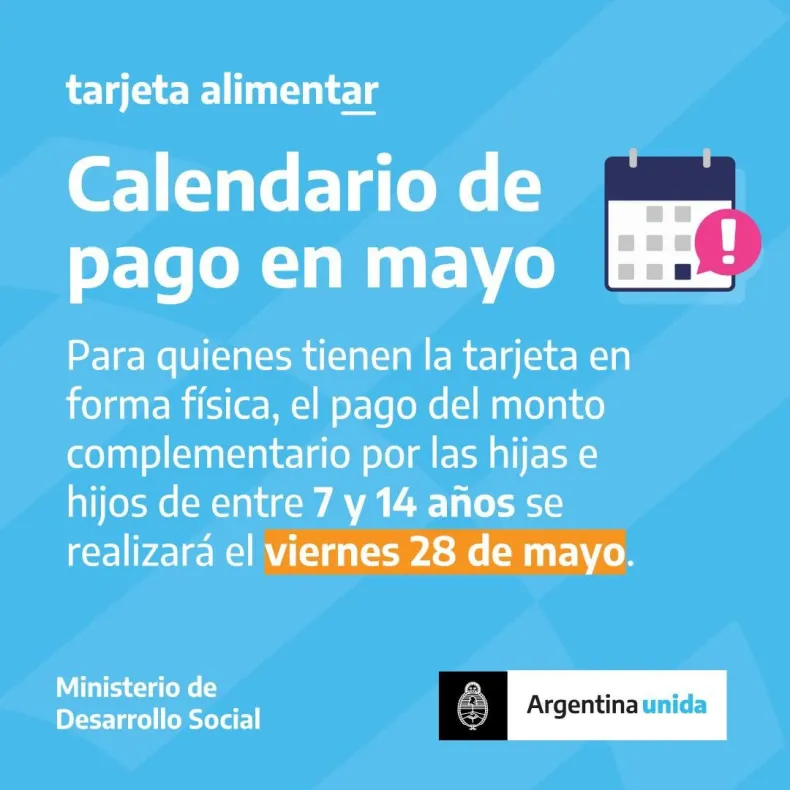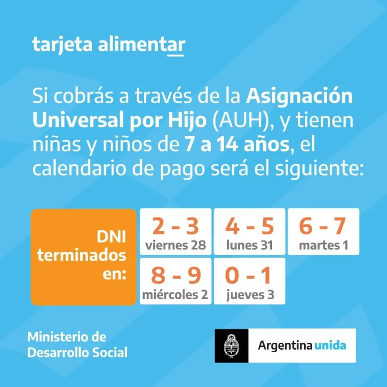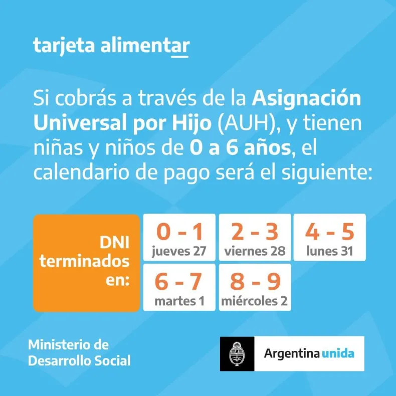 La Tarjeta Alimentaria, beneficio que hasta el mes pasado alcanzaba a todos los titulares de la AUH con niños menores de 6 años o niños discapacitados sin límite de edad y a las embarazadas titulares de AxE a partir de los 3 meses y ahora cubrirá también a los titulares de la AUH con niños de hasta 14 años y a madres con 7 hijos o más que perciben Pensiones no Contributivas, comenzará a acreditarse desde hoy siguiendo un calendario confirmado por Desarrollo Social de la Nación.