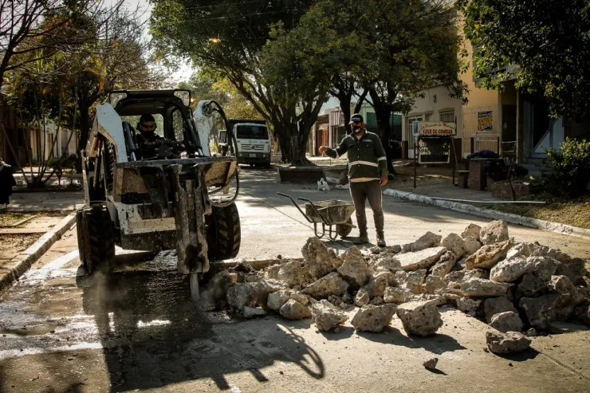 En Posadas al 400 y al 414, se realiza la reparación de dos baches de importante magnitud que se encuentran en la zona con larga data. Para poder solucionar este inconveniente y garantizar un tránsito vial seguro en la zona, el municipio trabaja con una minicargadora con un implemento adecuado para la rotura del pavimento en este sector dañado. Luego, se compacta el suelo y se vuelve a colocar hormigón de secado rápido para terminar el trabajo.