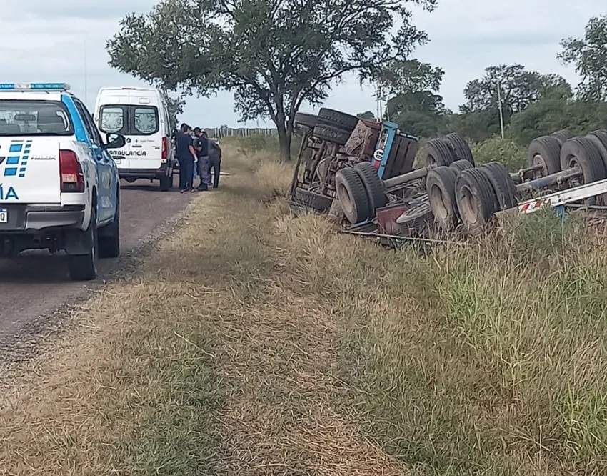 Cerca de las 16 de hoy, un camión con acoplado que trasportaba rollos de quebracho colorado, volcó en la banquina de Ruta 16, a la altura de la localidad de La Escondida.