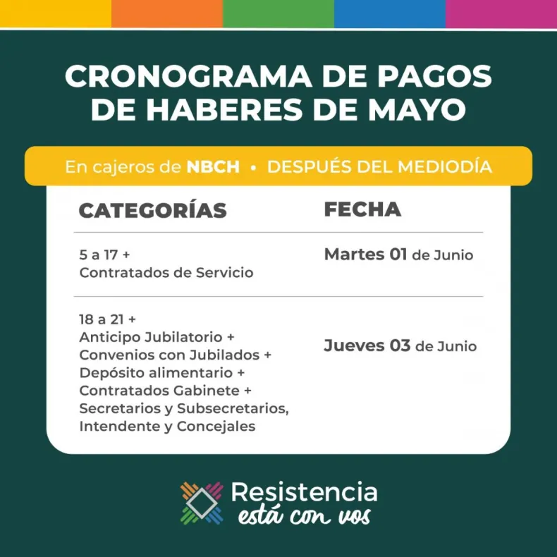 El Municipio de Resistencia comunicó que a partir de este martes 1 de junio iniciará el pago de sueldos de los empleados municipales, correspondiente al mes de mayo, los cuales serán depositados en las cuentas del Nuevo Banco del Chaco (NBCH).