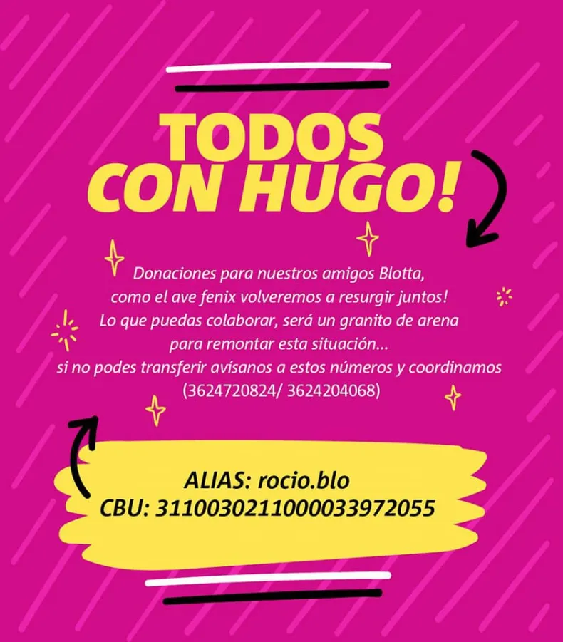 Para ayudar, se pueden realizar transferencias o depósitos al CBU 3110030211000033972055 – Alias: rocio.blo. O bien, comunicarse a los teléfonos 362 4 720824 – 362 4 204068.