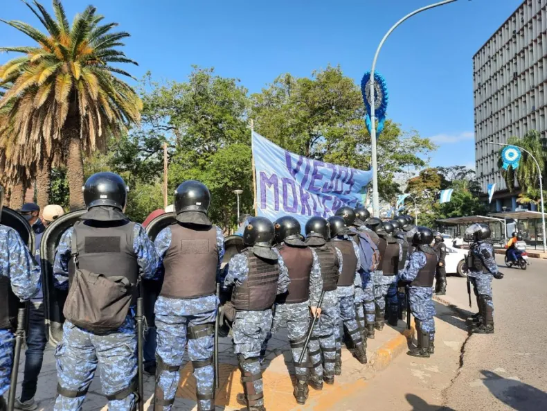Efectivos de la Policía del Chaco intervino en un corte de calles frente a Casa de Gobierno, cuando un grupo de alrededor de 20 personas del movimiento Viejos Moreneros se dispuso a cortar el tránsito.