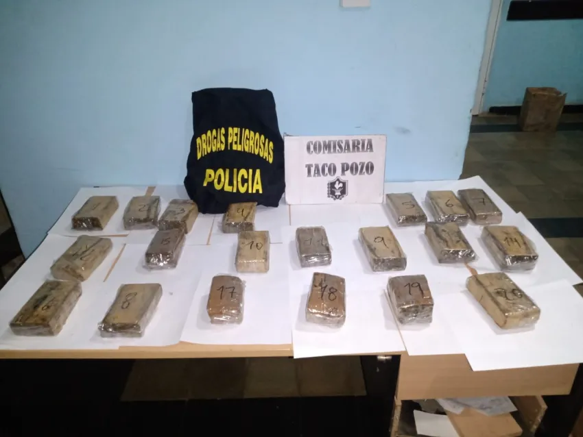 El primer procedimiento fue realizado en la localidad de Taco Pozo, en el paraje Santa Cruz camino Rural N° 20, donde secuestraron un bolso conteniendo en su interior 20 formatos de diferentes tamaños con marihuana, algo que se probó tras las pruebas de campo.
