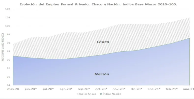 En el gráfico se observa cómo ha comportado el empleo formal privado a nivel nacional y provincial, para ello se toman las series de datos respectivas obtenidas de la AFIP. El análisis muestra la evolución que estas variables tuvieron en el último año en una medida comparable, considerando un período como base o de partida, que es el mes de inicio de declaración de la pandemia, marzo 2020 - Base=100. Para ello se utiliza el número índice, que es una medida estadística para establecer comparaciones entre dos o más variables, normalizando su escala.