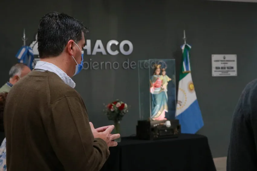 Mediante un sencillo acto, este lunes el gobernador Jorge Milton Capitanich encabezó la recepción de la imagen de la virgen perteneciente a la iglesia María Auxiliadora en su ingreso a la Casa de Gobierno, junto al Subsecretario de Gobierno, Raúl Bittel y el director de Cultos, Pedro García.