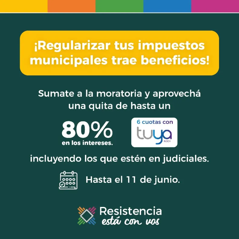 Este viernes 11 de junio vence el plazo para acogerse al régimen especial de facilidades de pago que dispone el Municipio de Resistencia para cancelar deudas municipales, con importantes descuentos en los intereses.