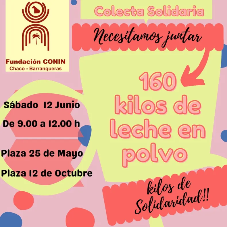 La Colecta Solidaria de Fundación CONIN Chaco se llevará a cabo el próximo sábado 12 de junio de 9 a 12 en las plazas 25 de Mayo y 12 de Octubre.